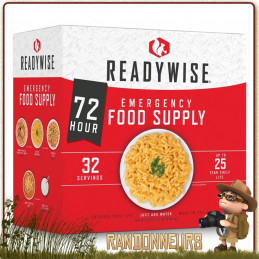 Pack Ration 72h00 Longue Conservation Ready Wise - Ready Wise, spécialiste des rations de survie et des packs rations alimentaires pour situations d'urgence, propose le pack 72h00 de repas survie longue conservations (près de 25 ans). Un kit de 32 portions variées équilibrées réparties entre petit-déjeuner, repas et boisson lactée, véritable réponse...