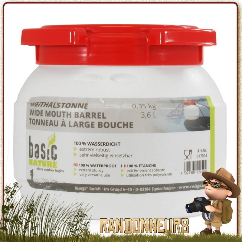 Touque Etanche 3.6 Litres Basic Nature - Touque, conteneur de transport hermétique et étanche pour protéger votre équipement, aliments et autres de l'eau et de la poussière. De qualité alimentaire, la touque est résistante aux chocs et possède un couvercle dont la saisie est facile. Pratique en excursions en canoé ou kayak, loisirs marines et voyages 4x4 à placer sur la galerie du véhicule. Les grands modèles peuvent être utilisés comme tabouret.