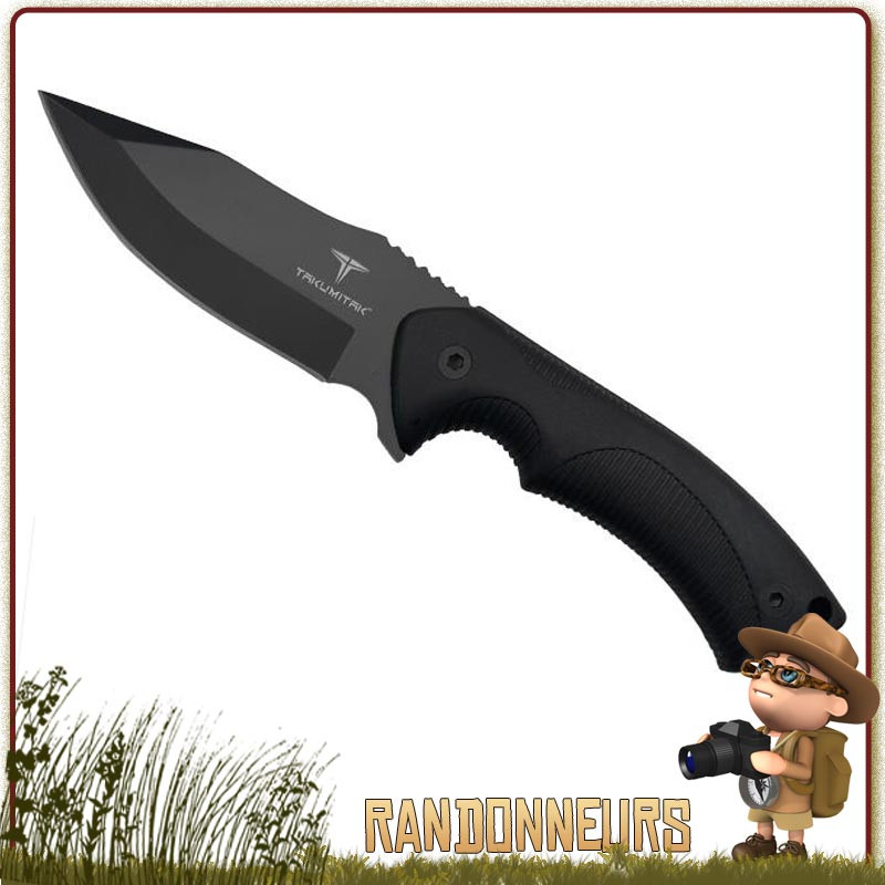 Poignard FIT Takumitak- Poignard tactique Takumitak FIT lame plate semelle 11 cm avec revêtement noir. Lot de deux plaquettes de manche interchangeable en FRN noir et Tan (Fibres de Nylon renforcées). Etui FRN avec clip compatible Molle pour un transport efficace et sécurisé. Poignard polyvalent pour la survie et le bushcraft.