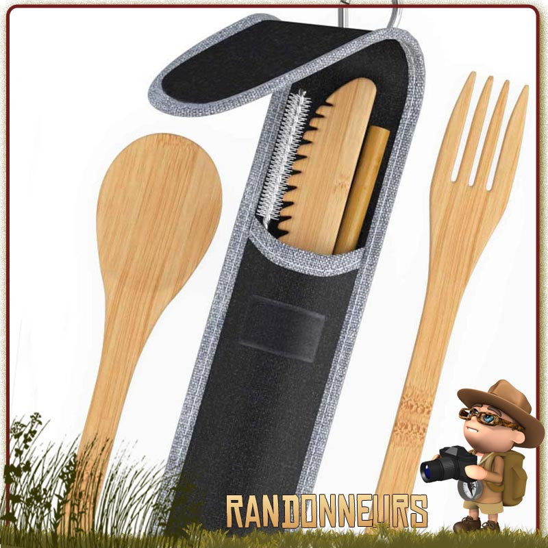 Set de couverts ultra léger de randonnée, combinaison judicieuse d'une cuillère, fourchette et couteau lame dentée, paille et brossette, le tout de conception bambou, matière première durable et écologique.