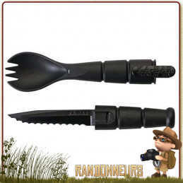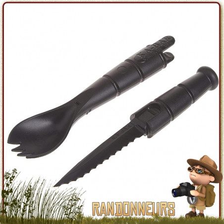 Fourchette et Couteau Tactique KaBar- Fouchette Cuillère Spoon et couteau tactique tout en un Ka-Bar idéal pour la randonnée comme les forces armées. En polymère plastique alimentaire ultra robuste et léger, ce set de couverts se glisse autant dans une poche que dans un kit de survie.