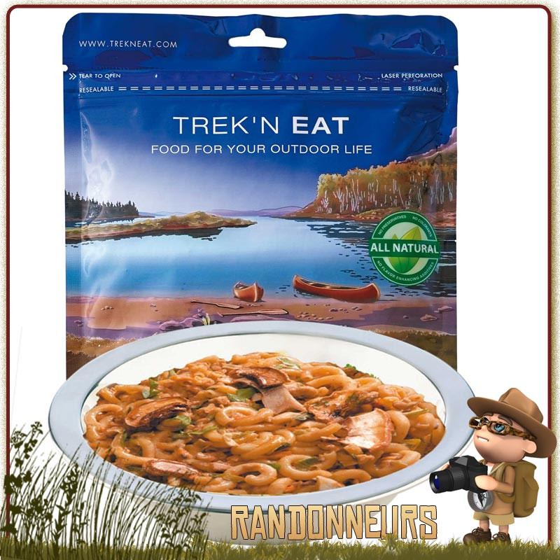Un bon repas lyophilisé végétarien simple pour la préparation de vos petits plats en randonnée... Toute l'énergie nécessaire "SAUTE DE CHAMPIGNONS ET SOJA AUX PÂTES TREK'N EAT" lyophilisé Trek-n Eat vite préparé