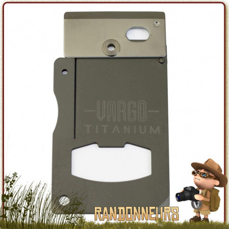 Lame Titane Swing Classic Vargo - Ce survival tool est un ingénieux équipement du randonneur et survivaliste. La lame Titane Swing Classic Vargo et une plaque en titane agrémentée d'une lame de rasoir en inox amovible, d'un décapsuleur et des deux têtes de tournevis plats
